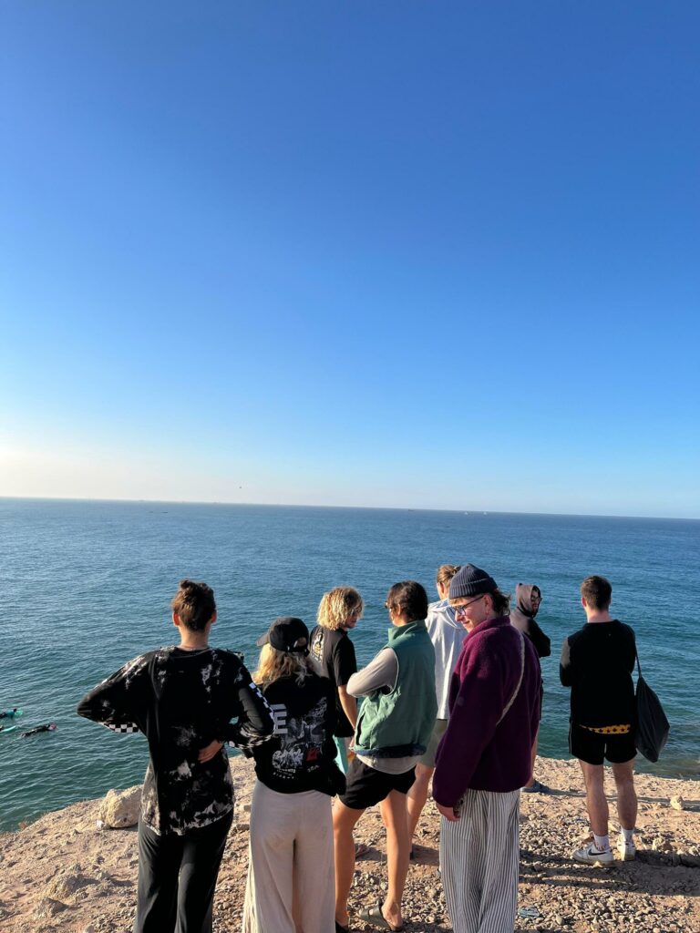 Our surf house sits in Tamraght, a friendly village in Taghazout Bay, just north of Agadir. It’s the perfect base: quiet at night, close to cafés and mini-markets, and minutes from a cluster of famous surf spots. You’ll feel the local vibe right away, kids playing football at sunset, the smell of fresh bread in the morning, and ocean views from the rooftops.